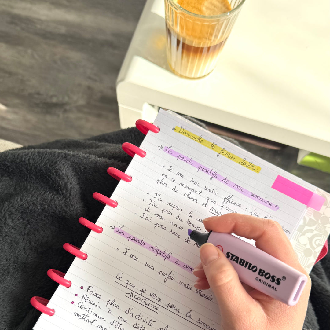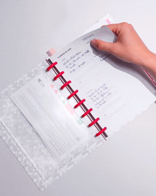 C’est justement tout l’intérêt ! Tu peux réorganiser ton carnet quand tu veux, autant de fois que tu veux. Tu veux commencer par la partie bien-être puis mettre les to-do derrière ? Aucun souci. C’est 100 % modulable, tout le temps. Tu déplaces, tu retires, tu remplaces .. Tout peut bouger à tout moment !
